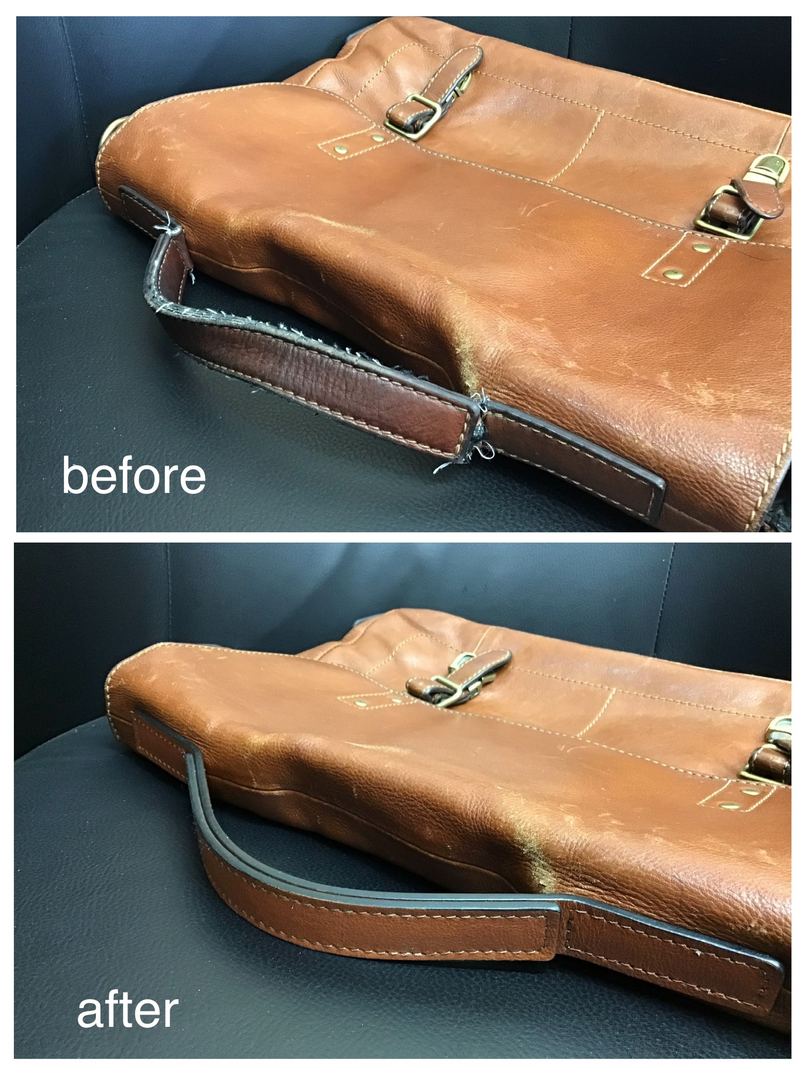 ハンドル交換(ハンドル作成、持ち手交換、持ち手修理 )をさせていただきました。かなりご愛用されているバッグかと思います。ハンドル(持ち手)が復活して、また長くご使用いただけるのではないでしょうか。