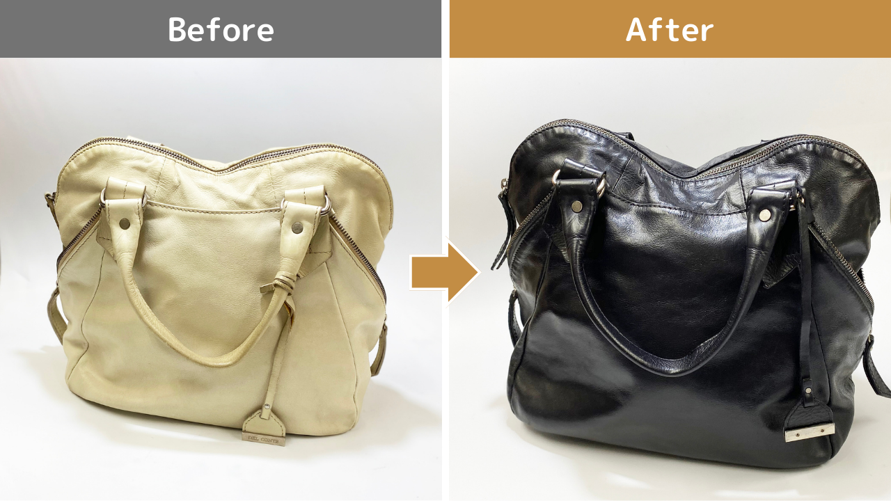 (濃い色→淡い色、及びスエード素材等は出来かねる場合がございます。また、革上に細かなステッチが施されている場合など、デザインによっては出来かねる場合もございます。判断が難しい場合にはお手数ですがお問い合わせ下さいます様お願い申し上げます。)リフレッシュクリーニングによって油分や汚れを落とし、染め直すための下処理を行って後に筆染めを行います。