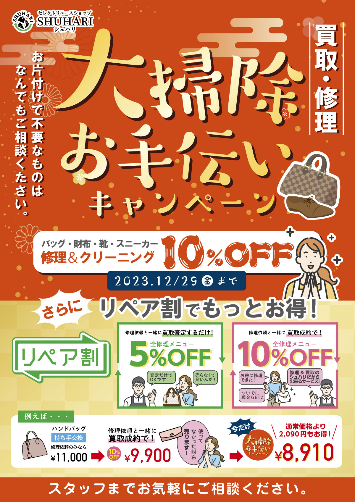 大家好!今年只剩下几个名额了。为了准备年终大扫除,店里将举办特价活动!通过“清洁帮助活动”,您可以以优惠的价格修理和清洁包包和鞋子。